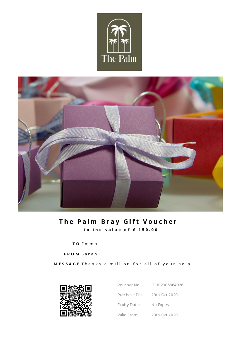 The Palm Bray allows you to purchase instantly printable gift vouchers, special offers and tickets using the Voucher Connect platform.